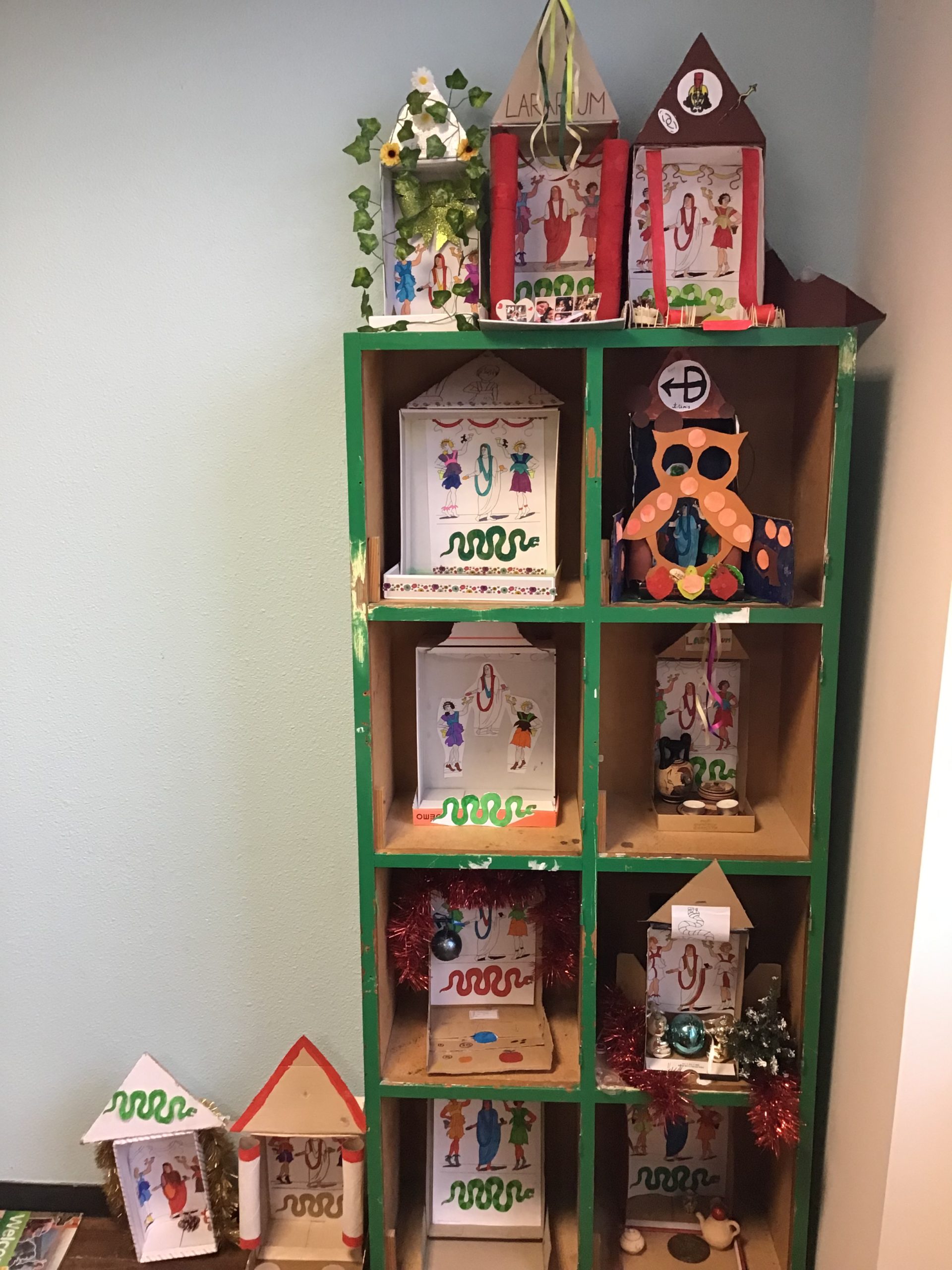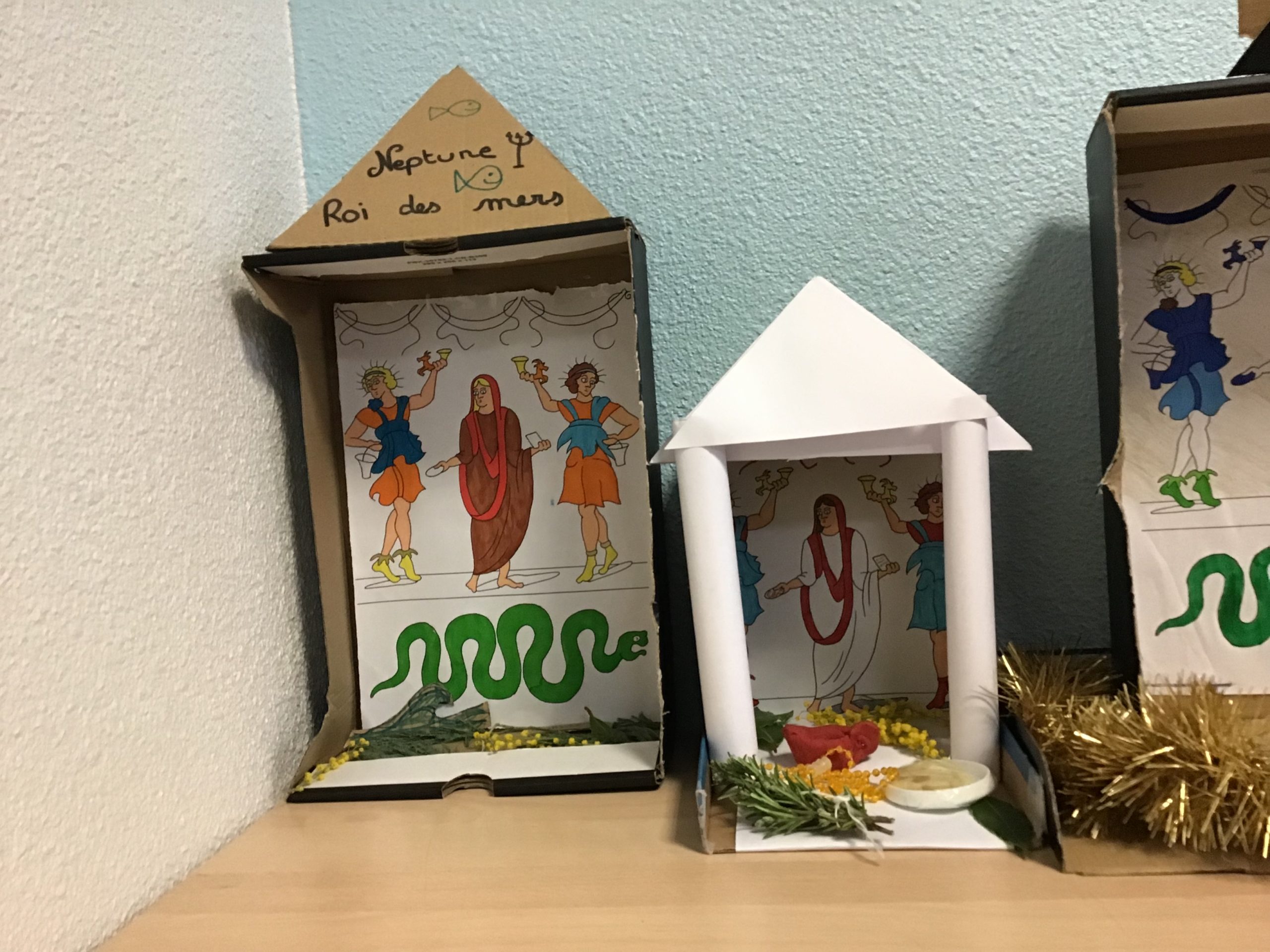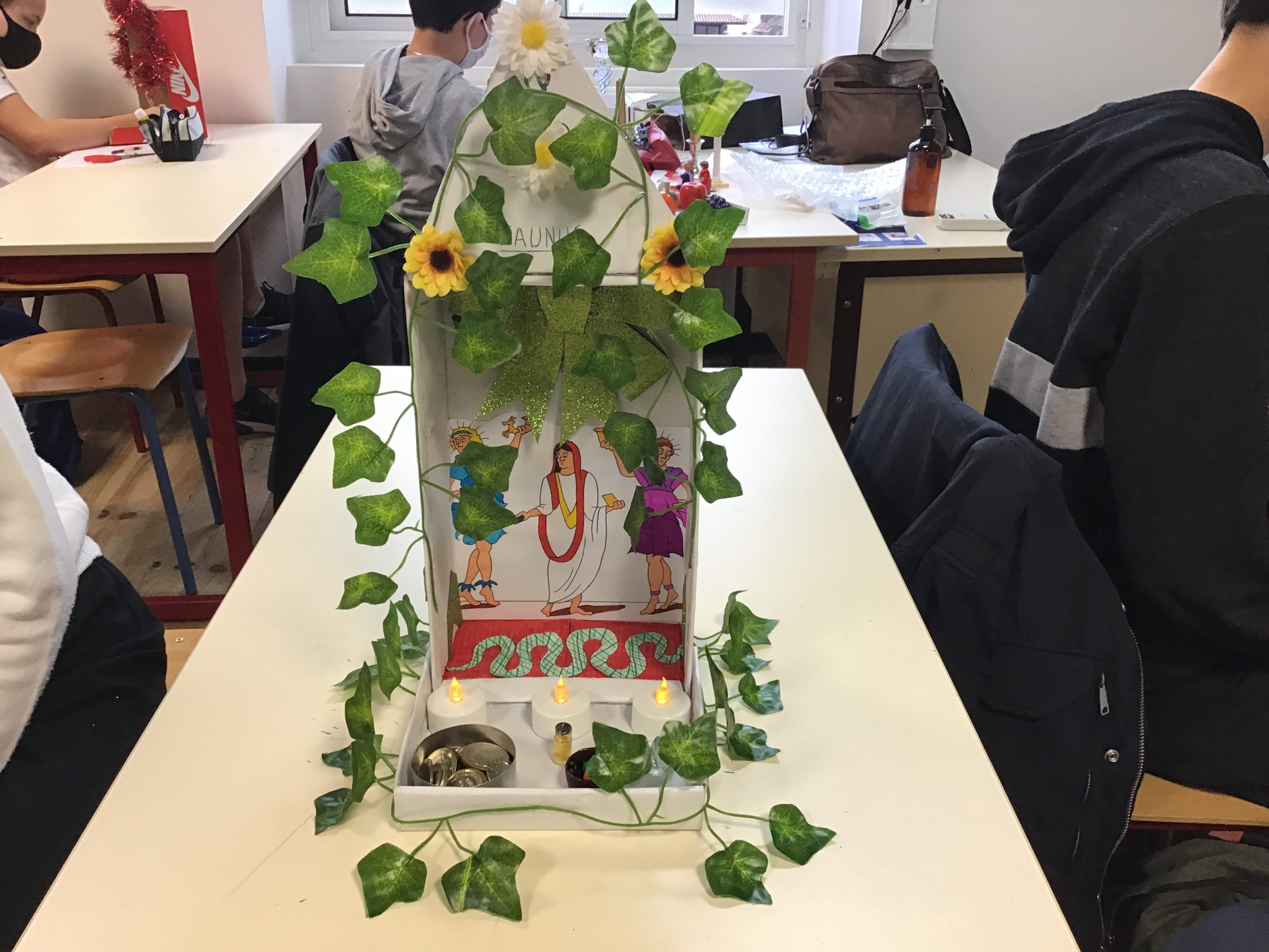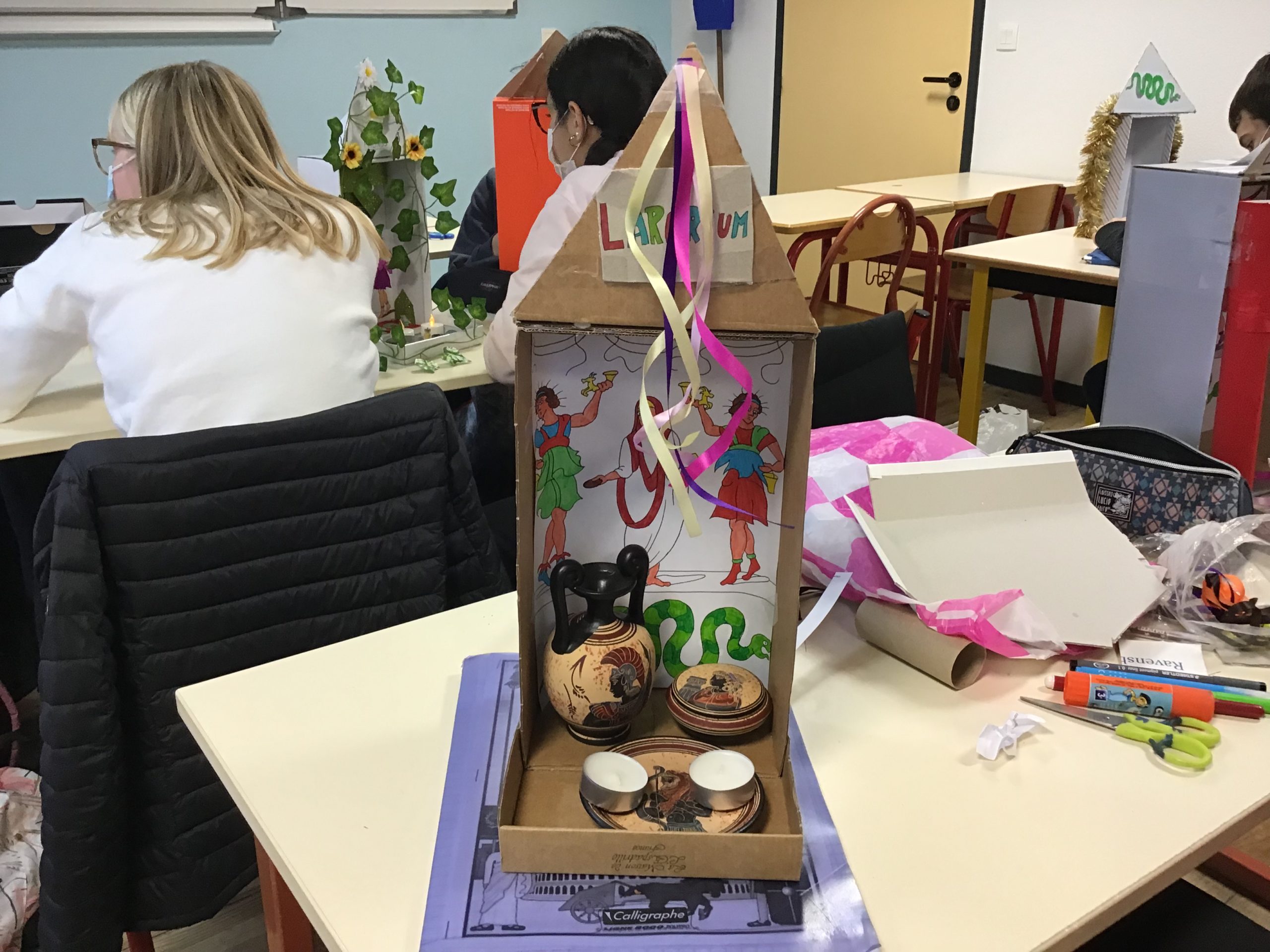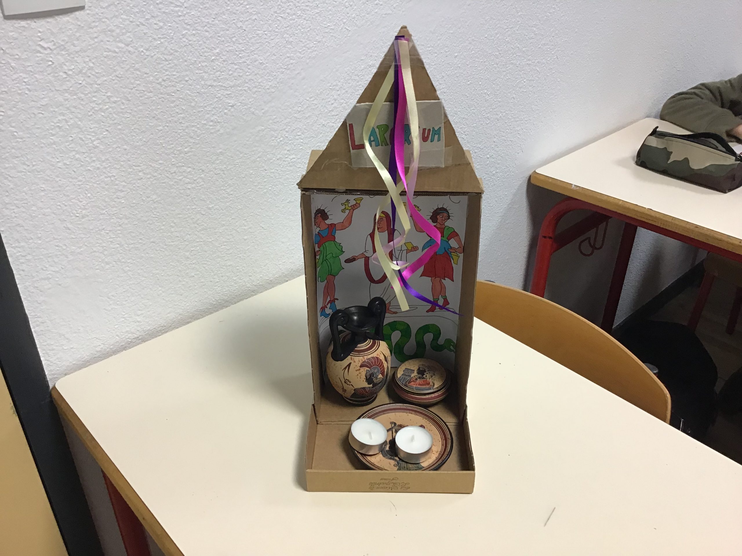 « Dans le cadre de notre travail sur la religion, les rites et traditions romaines, les quatrièmes latinistes ont réalisé des laraires en classe. Ce sont des autels familiaux que l’on trouvait à l’entrée de la domus ou de la villa des romains. Les citoyens romains, en famille, venaient rendre hommage aux dieux lares, petits génies du foyer, pour assurer longévité et prospérité. On y déposait des fruits, des bougies, des fleurs, des gâteaux ou des poteries.