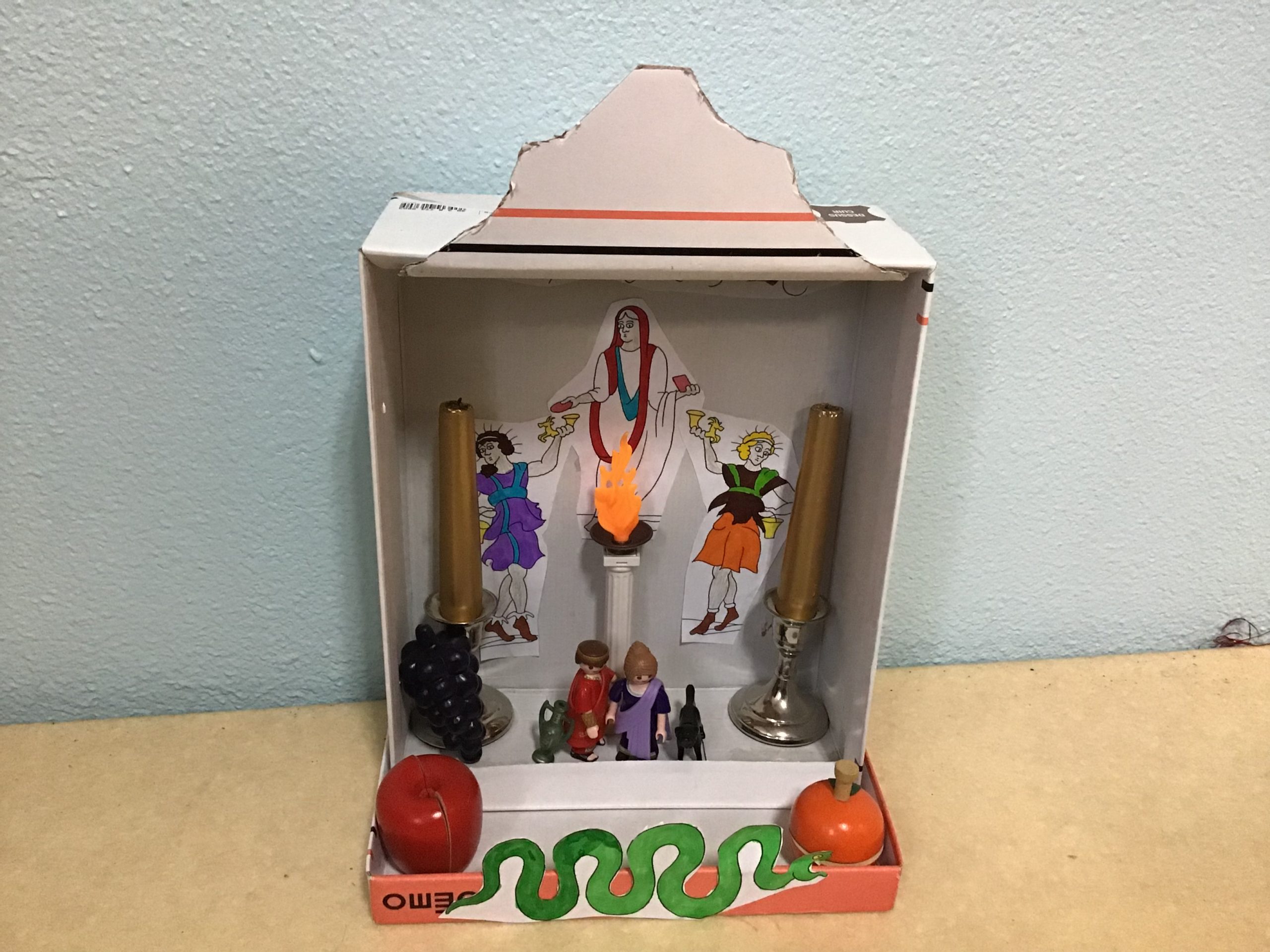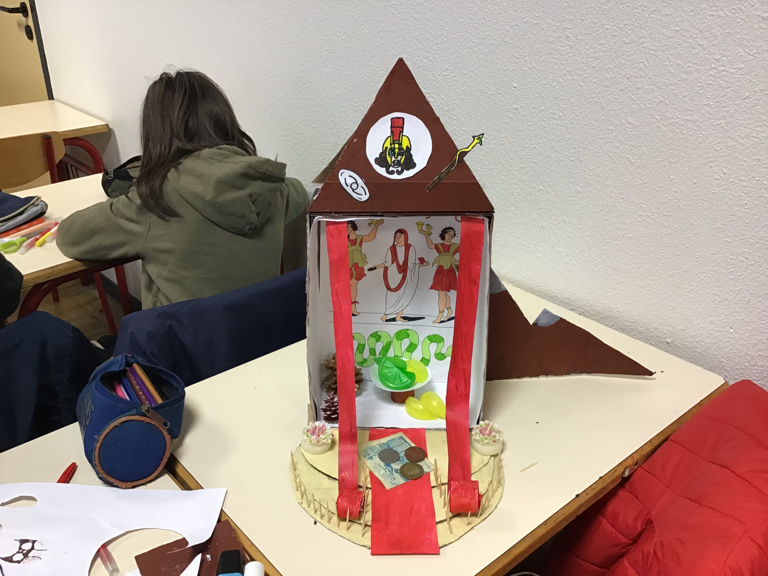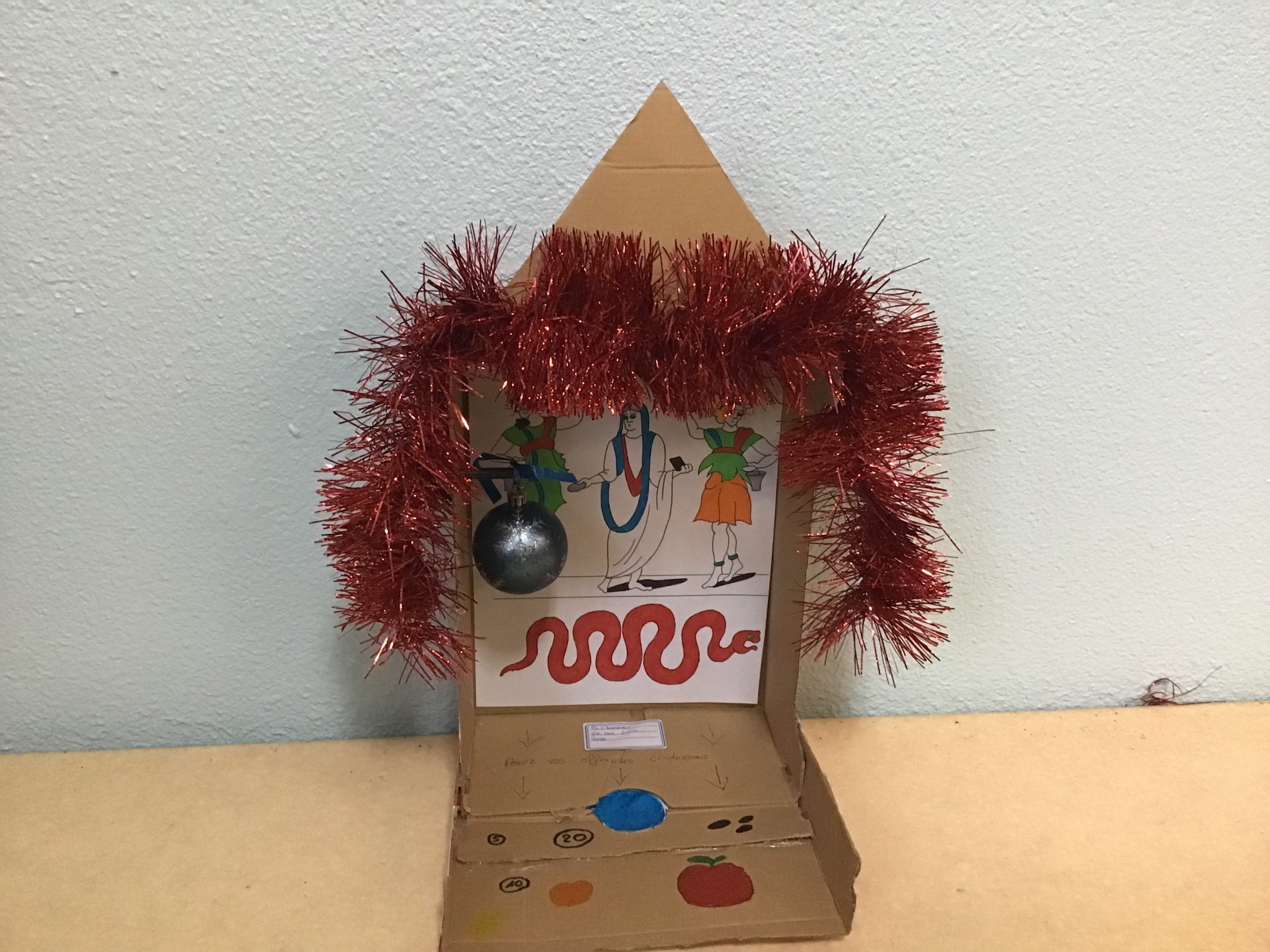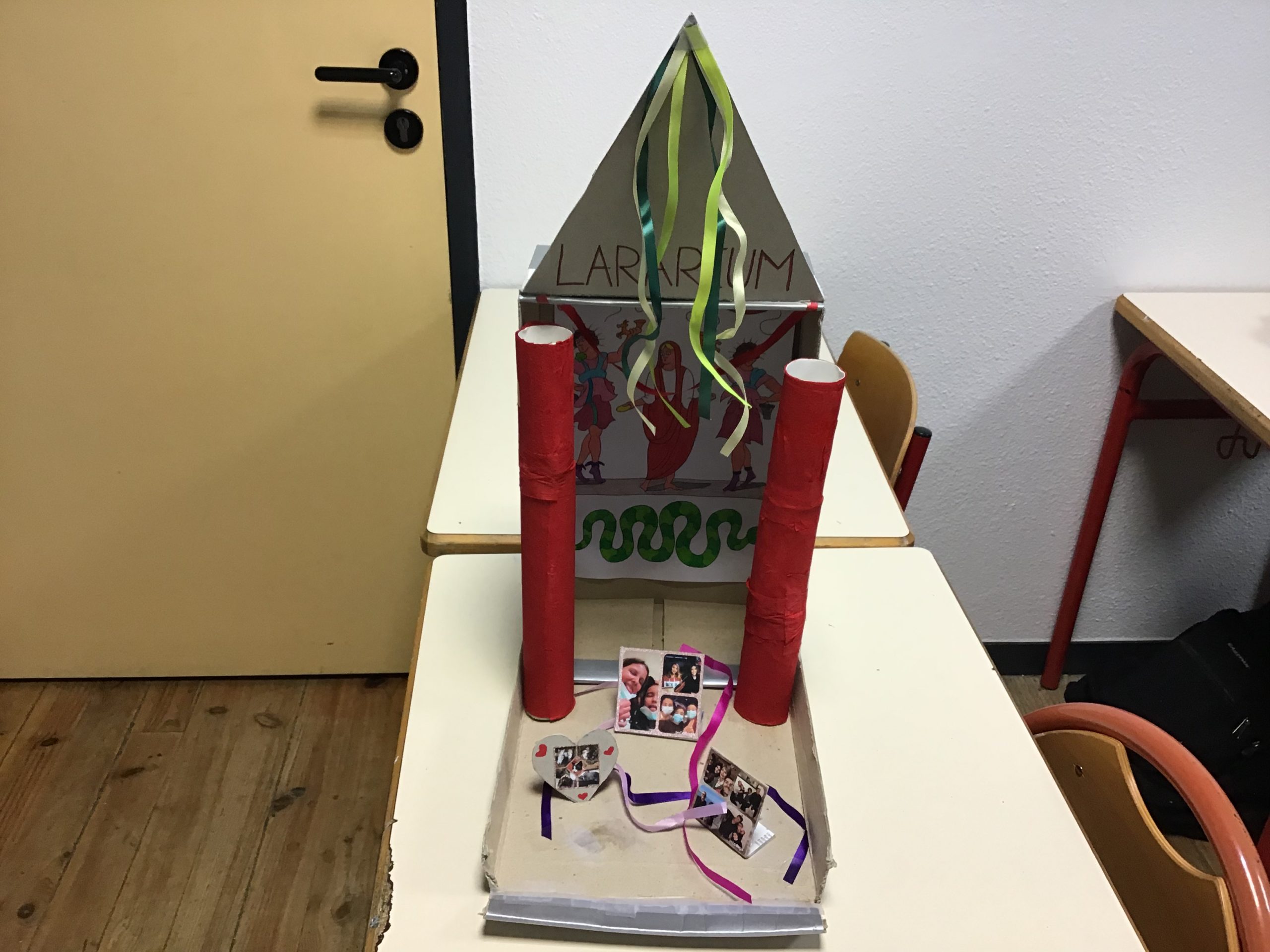 « Dans le cadre de notre travail sur la religion, les rites et traditions romaines, les quatrièmes latinistes ont réalisé des laraires en classe. Ce sont des autels familiaux que l’on trouvait à l’entrée de la domus ou de la villa des romains. Les citoyens romains, en famille, venaient rendre hommage aux dieux lares, petits génies du foyer, pour assurer longévité et prospérité. On y déposait des fruits, des bougies, des fleurs, des gâteaux ou des poteries.