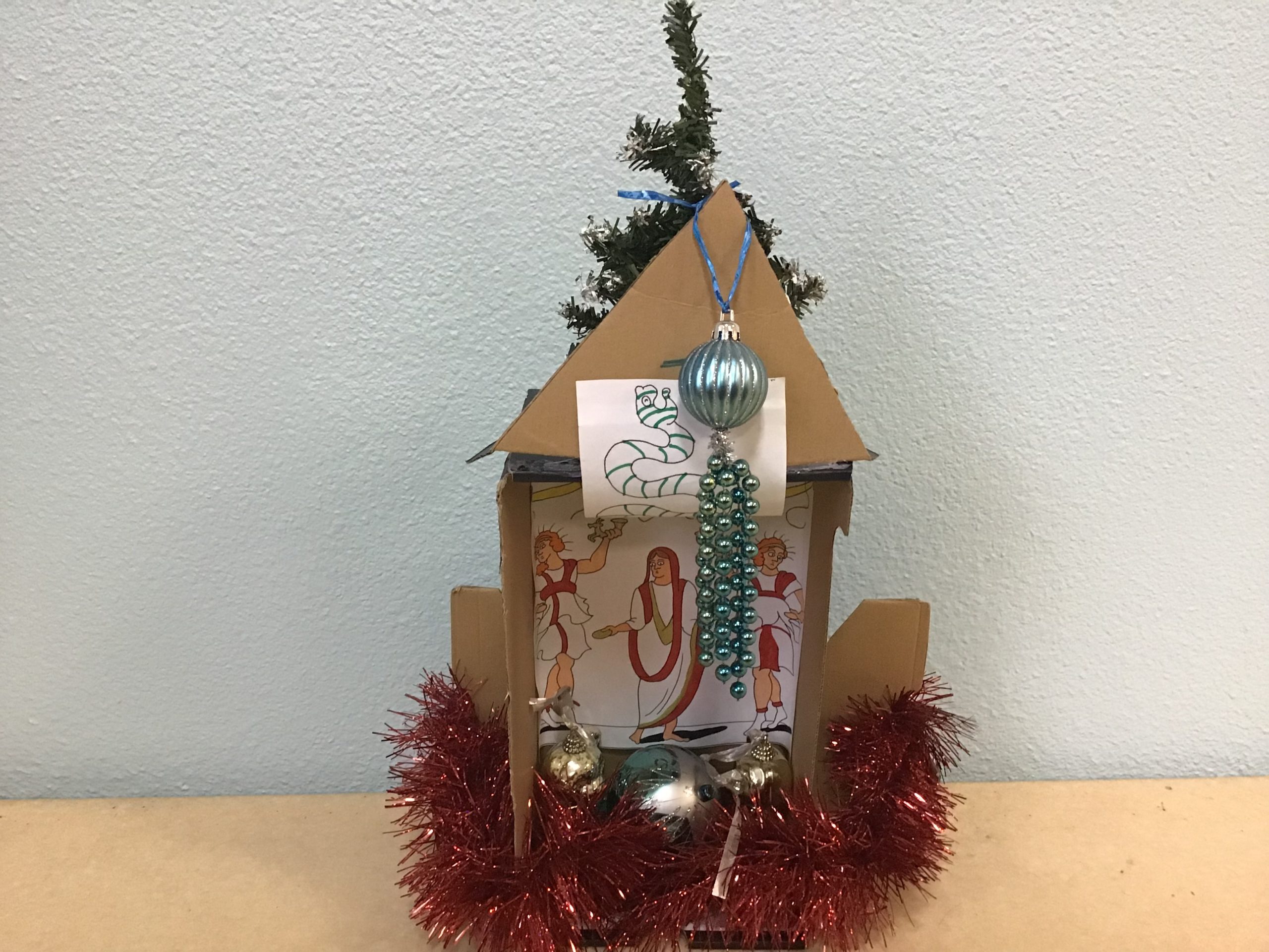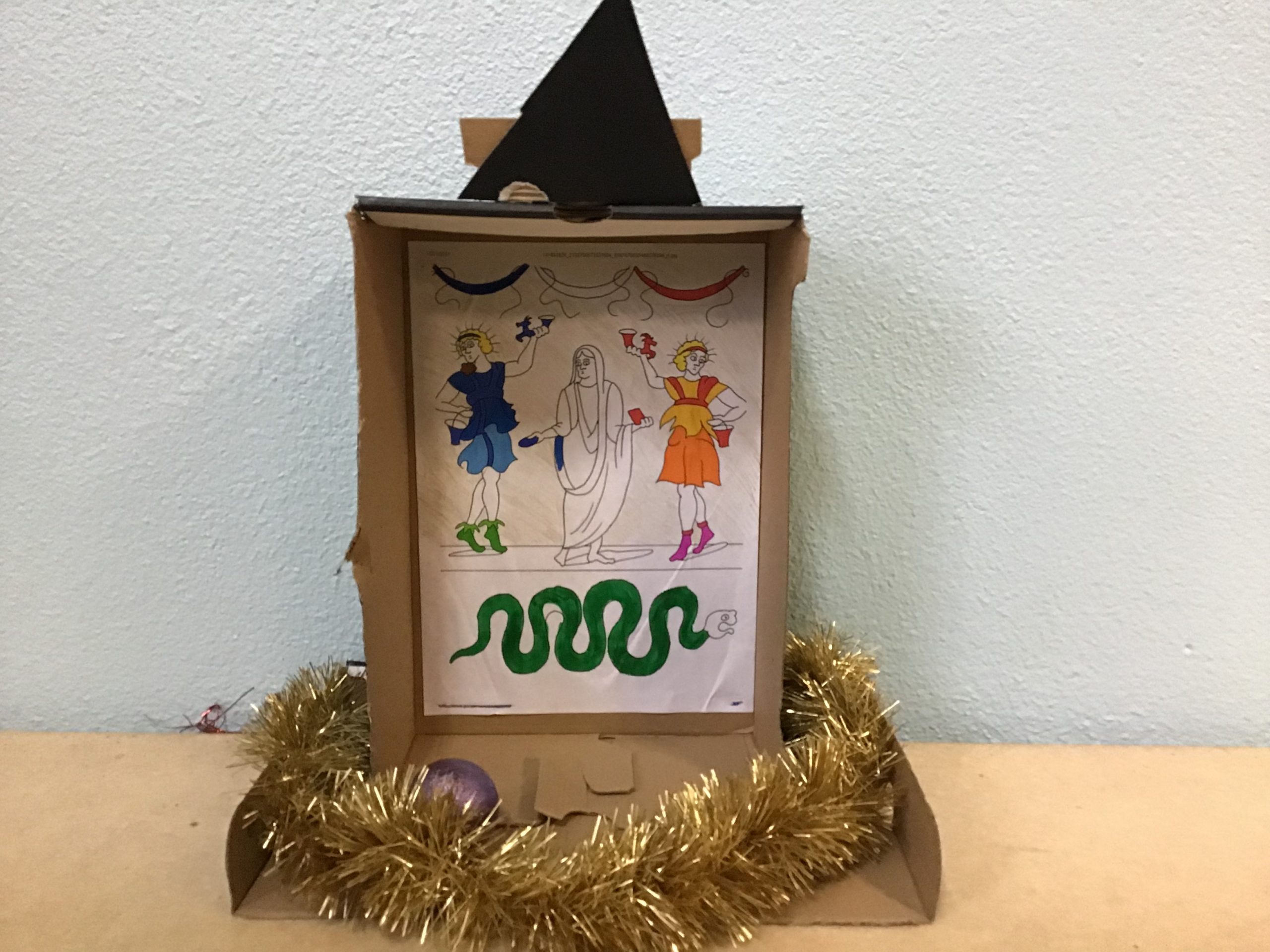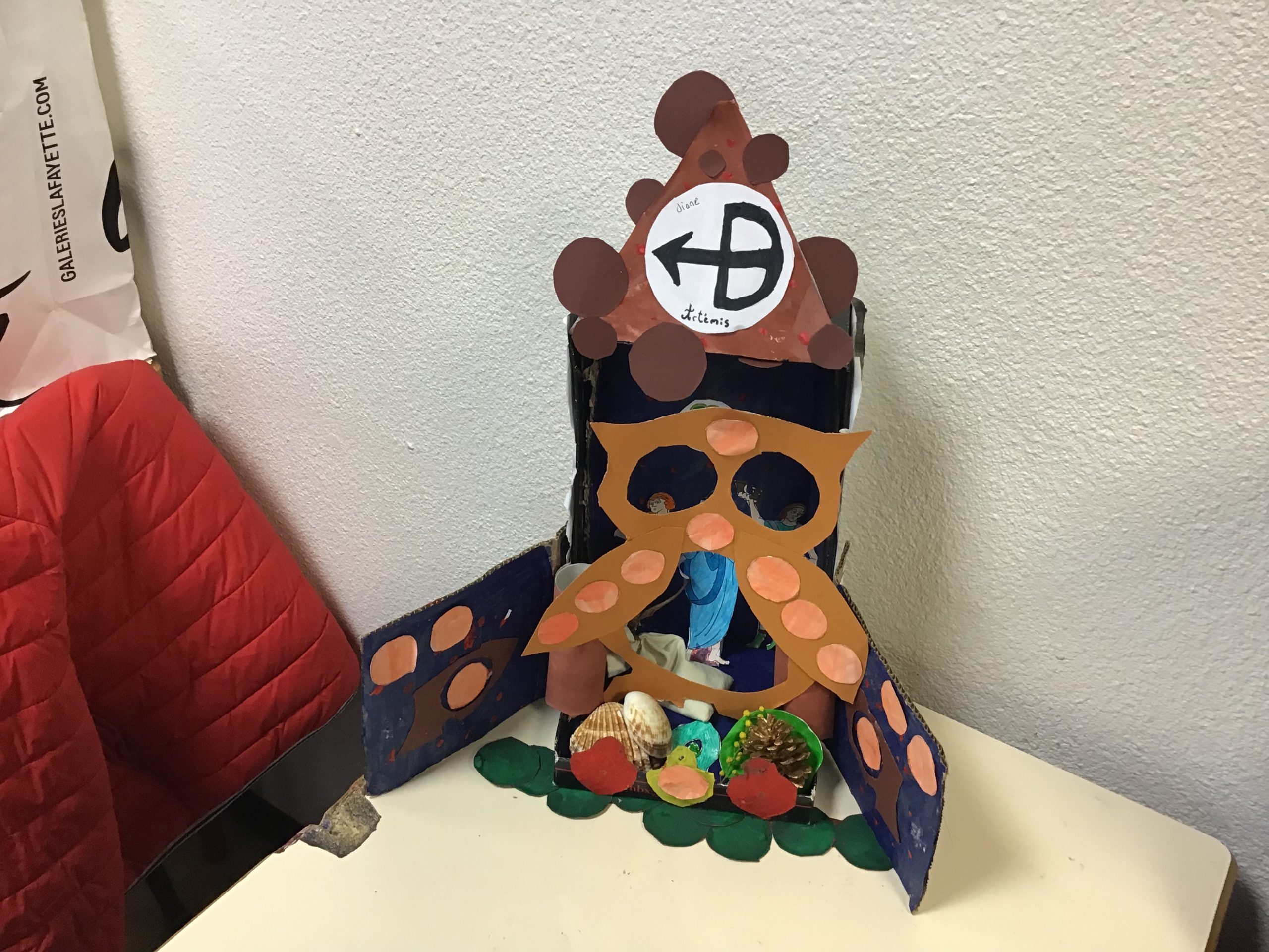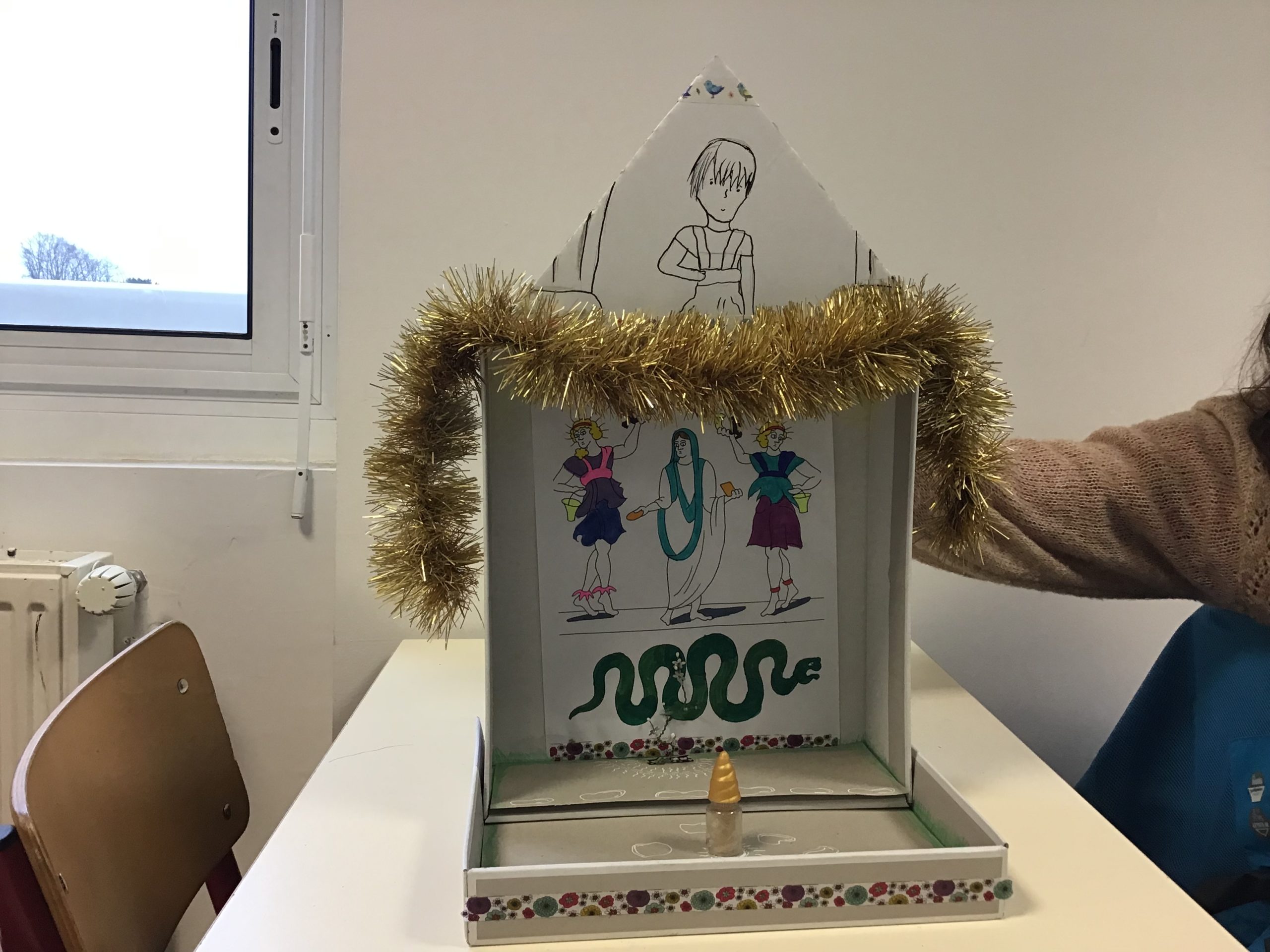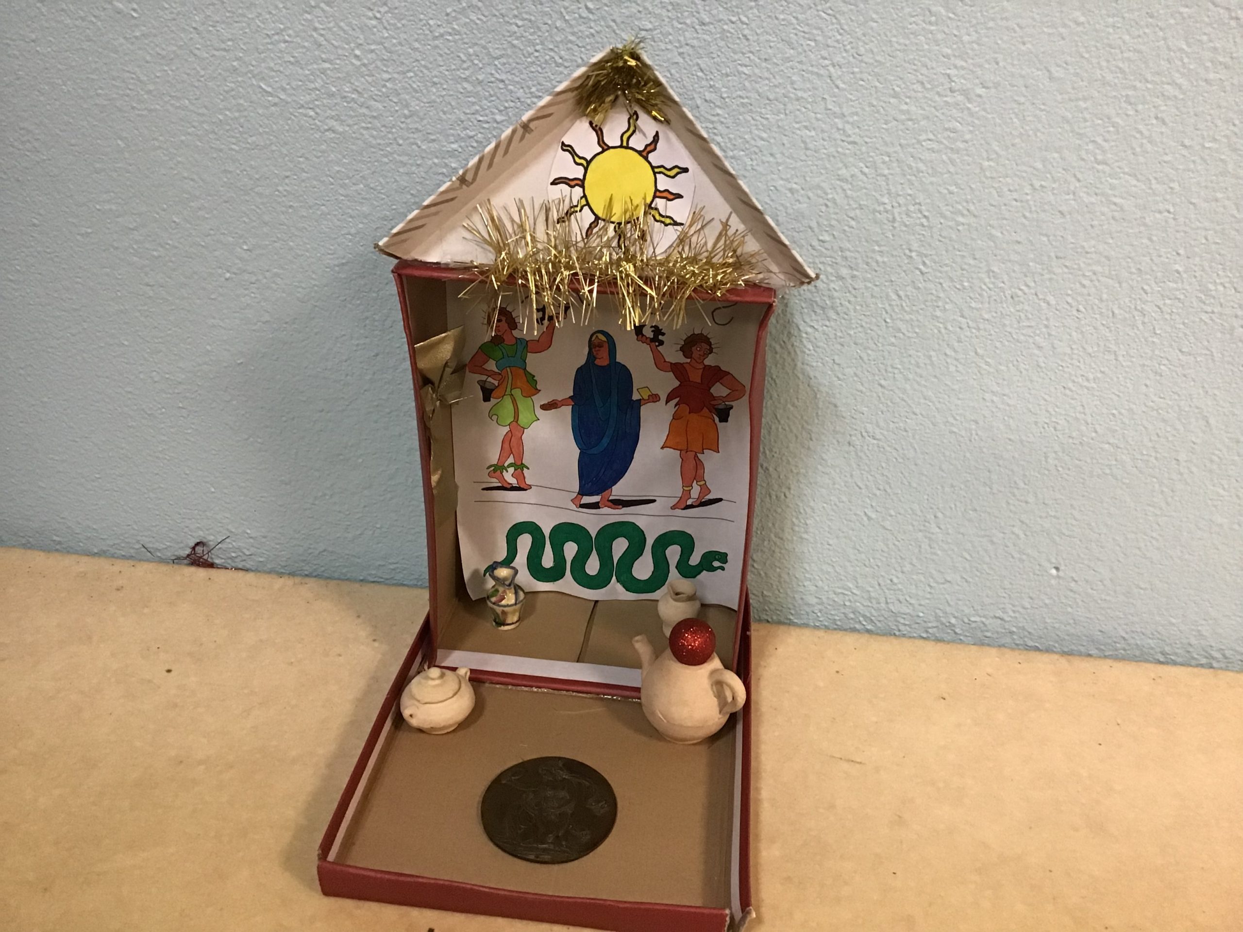 « Dans le cadre de notre travail sur la religion, les rites et traditions romaines, les quatrièmes latinistes ont réalisé des laraires en classe. Ce sont des autels familiaux que l’on trouvait à l’entrée de la domus ou de la villa des romains. Les citoyens romains, en famille, venaient rendre hommage aux dieux lares, petits génies du foyer, pour assurer longévité et prospérité. On y déposait des fruits, des bougies, des fleurs, des gâteaux ou des poteries.